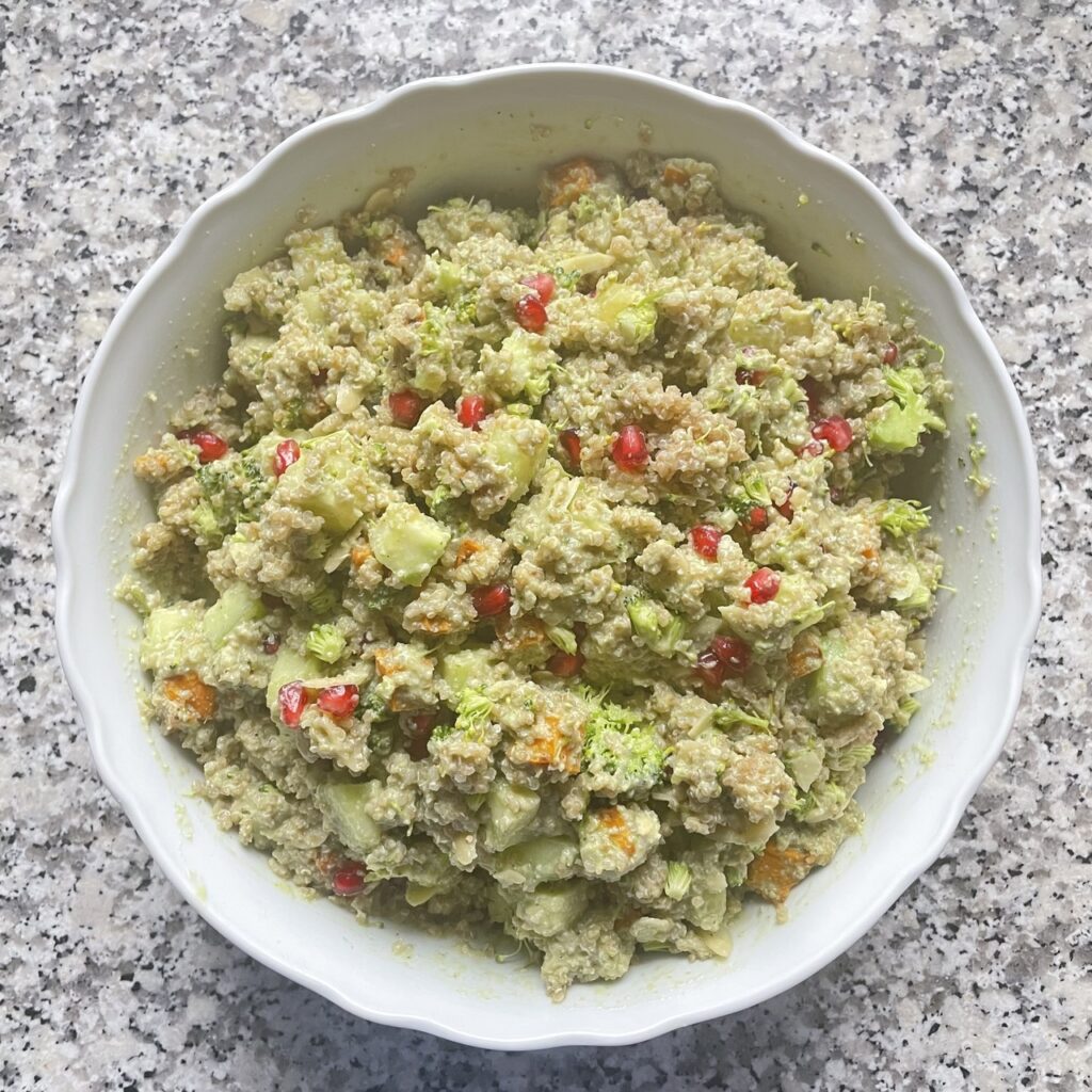 Sałatka z quinoa, brokułem i granatem jest daniem odpowiednim dla wegan oraz dla osób na diecie bezglutenowej.